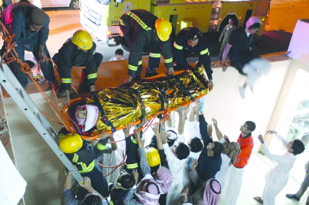 فرق الدفاع المدني لحظة نقلها المصاب. (عكاظ)