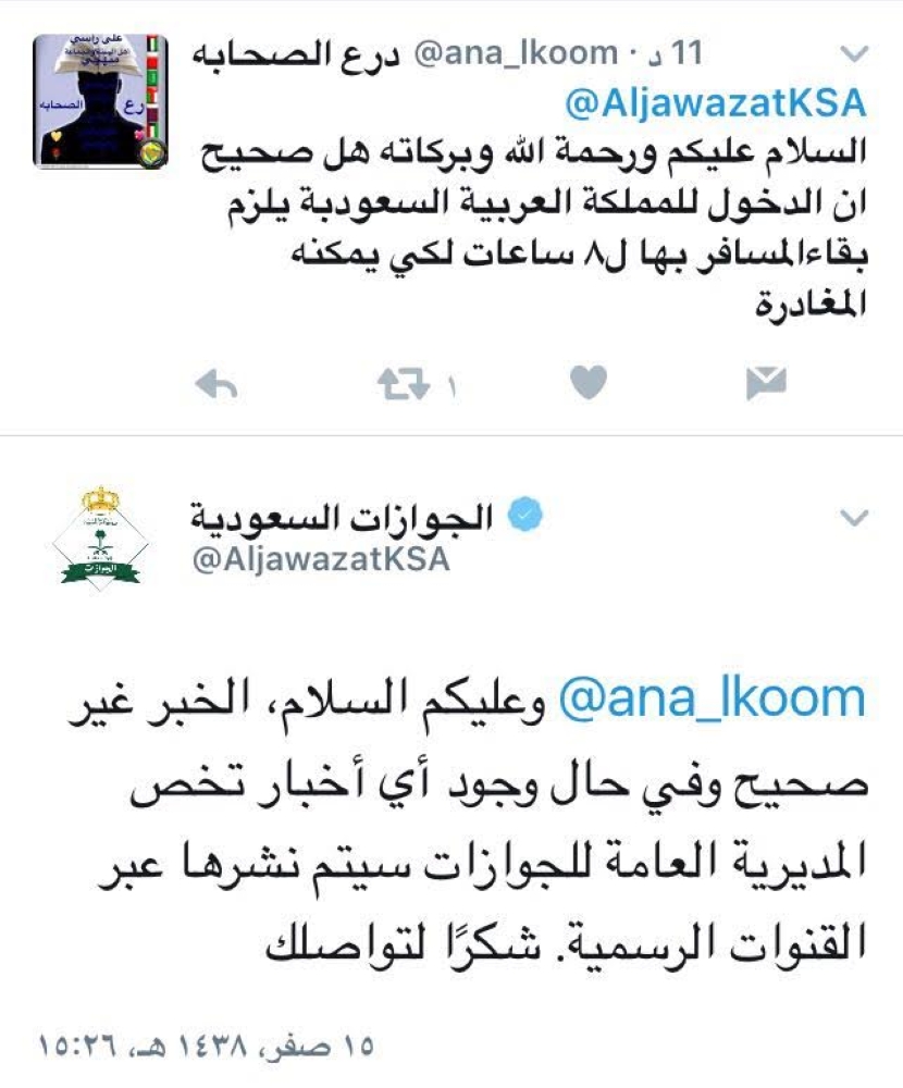 وردت «الجوازات» من خلال حسابها في «تويتر»، على العديد من الأسئلة لمغردين حول الموضوع.