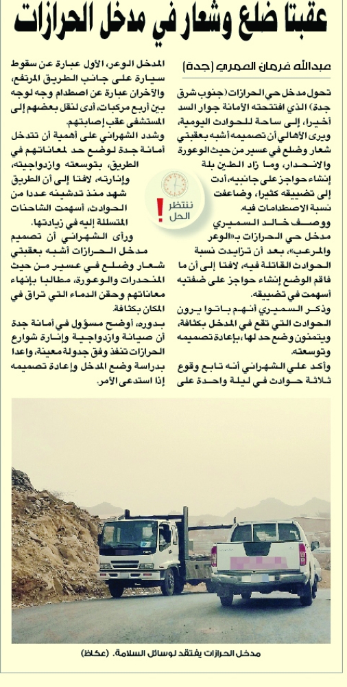 وكانت «عكاظ» نشرت الأسبوع الماضي عن مدخل الحرازات بعنوان «عقبتا ضلع وشعار في مدخل الحرازات»، إذ طالب الأهالي باستحداث التفافات منظمة تخدم مثلث الحرازات من الجنوب والشمال، واستكمال إنارة الأعمدة في الشوارع الرئيسية والرصف والتنسيق.