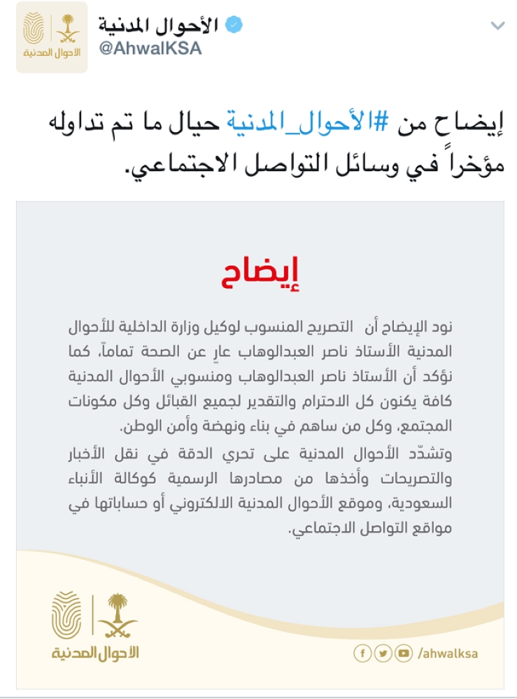 نفت وكالة وزارة الداخلية للأحوال المدنية، صحة التصريح المنسوب لوكيل الأحوال المدنية ناصر العبدالوهاب، والذي تضمن إساءة لبعض القبائل، مؤكدة أنه عارٍ تماماً من الصحة.