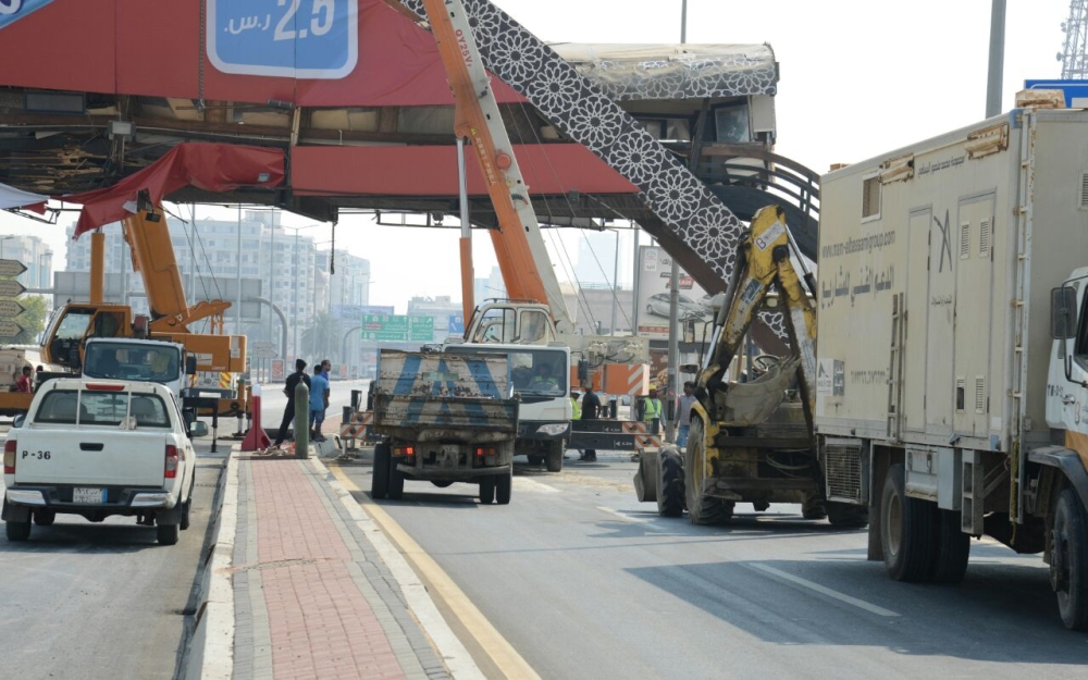وتسببت الشاحنة في إغلاق طريق المدينة الطالع والنازل قرب شارع فلسطين، بعد ارتطامها بجسر المشاة الخشبي، ما تسبب في تحطمه وتحركه من مكانه، الأمر الذي شكل خطورة كبيرة على مرتادي الطريق من مركبات وعابرين.