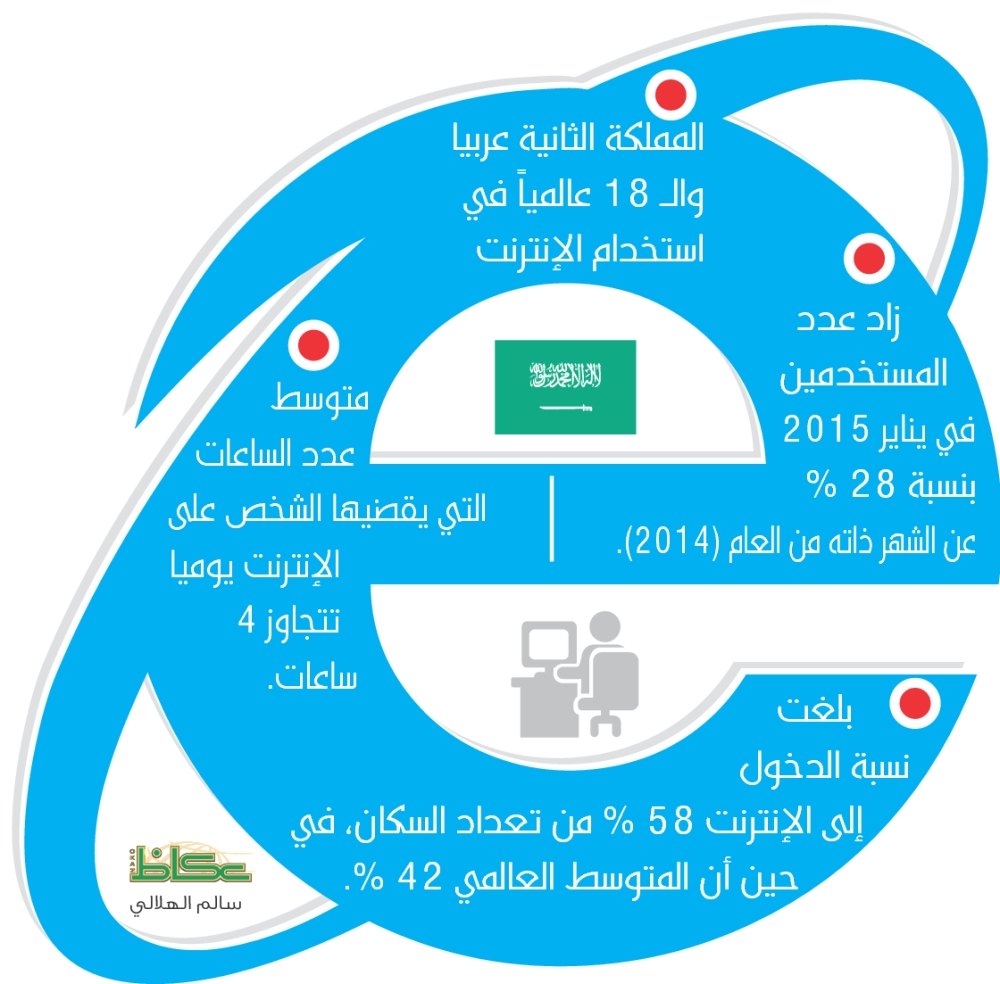 بدوره أوضح مدير جامعة الدمام الدكتور عبدالله بن محمد الربيش أن عدد مستخدمي الإنترنت النشطين في المملكة تجاوز 18 مليون مواطن، فيما زاد عدد مستخدمي الإنترنت النشطاء في يناير 2015 بنسبة 28% عن الشهر ذاته من العام السابق (2014)، مشيراً إلى أن متوسط عدد الساعات التي يقضيها الشخص على الإنترنت يوميا يتجاوز أربع ساعات. وبلغت نسبة الدخول إلى الإنترنت 58% من تعداد السكان، في حين أن المتوسط العالمي 42%، مؤكداً أن المملكة تحتل المركز 18 عالمياً والثاني عربيا تليها مصر بنسبة 53% وتسبقها الإمارات بنسبة 92%.