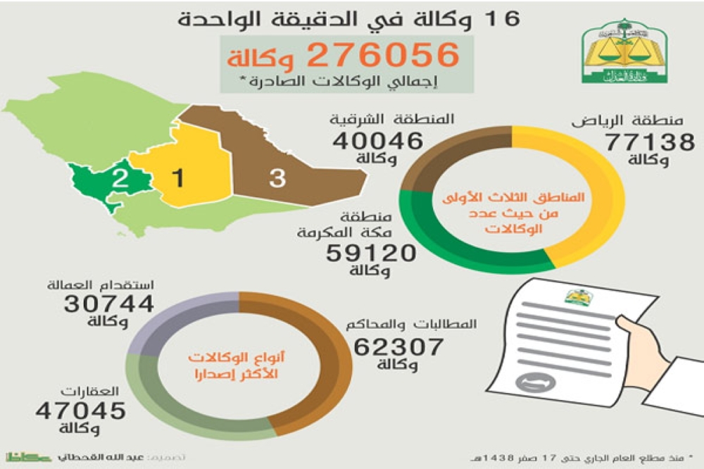 ارتفع معدل إصدار الوكالات في الفترة من مطلع العام الحالي حتى الخميس الماضي، إذ أصدرت كتابات العدل في كافة أنحاء المملكة 276056 وكالة بمعدل 7887 وكالة يومياً أي ما يعادل 16.4 وكالة في الدقيقة.