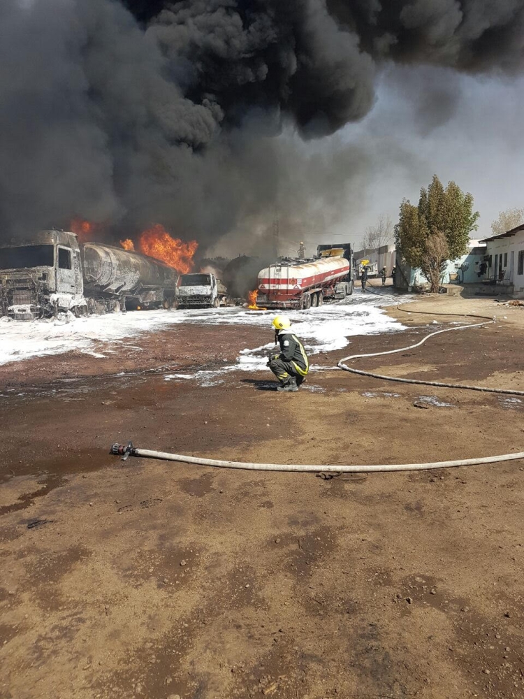 وأضاف " إن فرق الدفاع المدني تمكنت من إخماد الحريق، فيما قامت فرق من الهلال الاحمر بنقل المصابين إلى المستشفيات القريبة لتلقي العلاج.