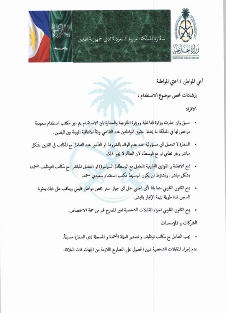 نشرت سفارة خادم الحرمين الشريفين لدى مانيلا إرشادات مهمة للأفراد والمؤسسات والشركات فيما يتعلق باستقدام العمالة من الفلبين. وأوردت السفارة عددا من التنبيهات والتحذيرات من عدد من المخالفات في استقدام العمالة من الفلبين، وجاءت الإرشادت للأفراد على النحو التالي: أن يتم استقدام العمالة الفلبينية عبر مكاتب استقدام سعودية مرخص لها في المملكة، وذلك لحفظ حقوق المواطنين عند التقاضي وفقا للاتفاقية المبرمة بين البلدين. ولا تتحمل السفارة أية مسؤولية عند عدم الوفاء بالشروط أو التأخير عند التعامل مع المكاتب في الفلبين بشكل مباشر وغير نظامي أو مع الوسطاء لأن النظام لايجيز ذلك. تمنع الأنظمة والقوانين الفلبينية التعامل مع الوسطاء (السماسرة) أو التعامل المباشر مع مكاتب التوظيف المعتمدة بشكل مباشر، وتشترط أن يكون الوسيط مكتب استقدام سعوديا معتمدا. يمنع القانون الفلبيني منعا باتا لأي اجنبي حمل أي جواز سفر يخص مواطنا فلبينيا ويعاقب على ذلك بعقوبة السجن لمدة طويلة بتهمة الاتجار بالبشر. كما يمنع القانون الفلبيني إجراء المقابلات الشخصية لغير المصرح لهم من جهة الاختصاص. كما جاءت ارشادت خاصة من قبل سفارة المملكة لدى الفلبين للشركات والمؤسسات على النحو التالي: يجب التعامل مع مكاتب توظيف وتصدير العمالة المعتمدة والمسجلة لدى السفارة مسبقا. عدم إجراء المقابلات الشخصية دون حصول على التصاريح اللازمة من الجهات ذات العلاقة.