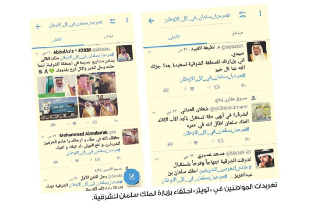 وكانت قد تصدرت هاشتاقات عبارات #مرحبا_بسلمان_في_كل_الأوطان و«أشرقت الشرقية»، إضافة إلى هاشتاقات أخرى عكست ما يختلج في صدور أهالي المنطقة الشرقية من حب ووفاء للوالد القائد في موقع التواصل الاجتماعي «تويتر»، والتي أطلقت ترحيباً بزيارة خادم الحرمين الشريفين الملك سلمان بن عبدالعزيز التفقدية للمنطقة وتلبيةً لطموحات المواطنين، وإطلاق عدد من المشاريع التنموية ومركز الملك عبدالعزيز الثقافي العالمي.