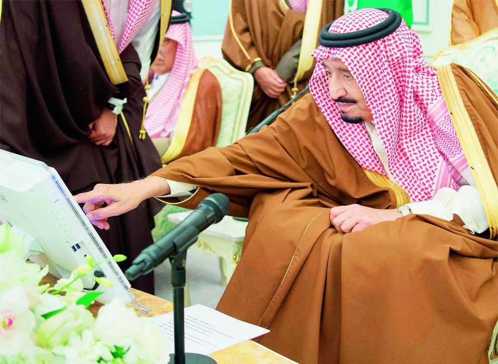 خادم الحرمين مدشنا مشاريع الإسكان في الأحساء أمس إلكترونيا.