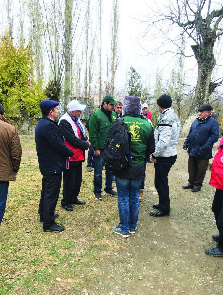 فريق مركز الملك سلمان يقف على أحد المشاريع الممولة من المركز في طاجيكستان أمس. (واس)