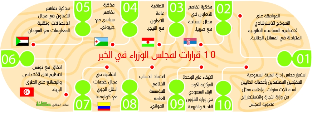 الموافقة على اتفاق بين حكومة المملكة العربية السعودية وحكومة الجمهورية التونسية لتنظيم نقل الأشخاص والبضائع على الطرق البرية (الطرقات) بين وعبر أراضي البلدين، الموقع في مدينة (الرياض) بتاريخ 11/3/1437هـ.