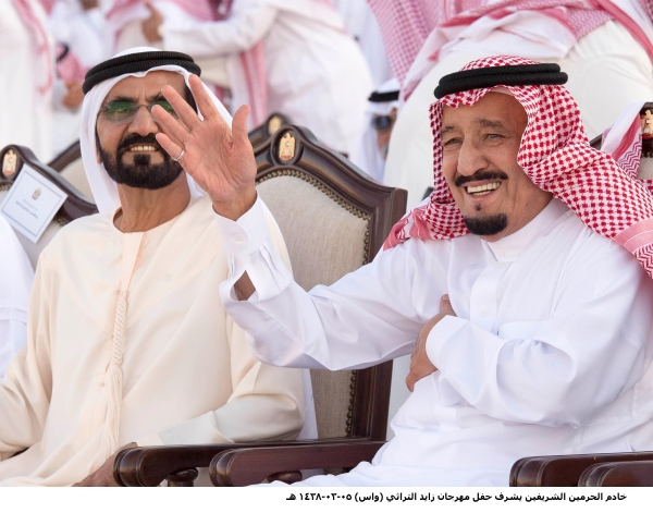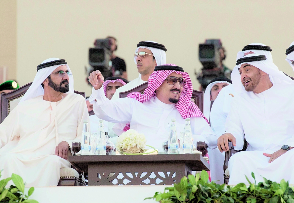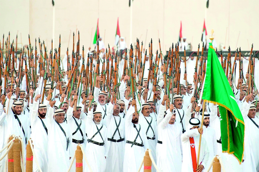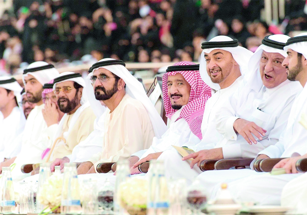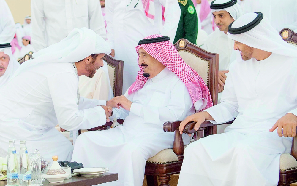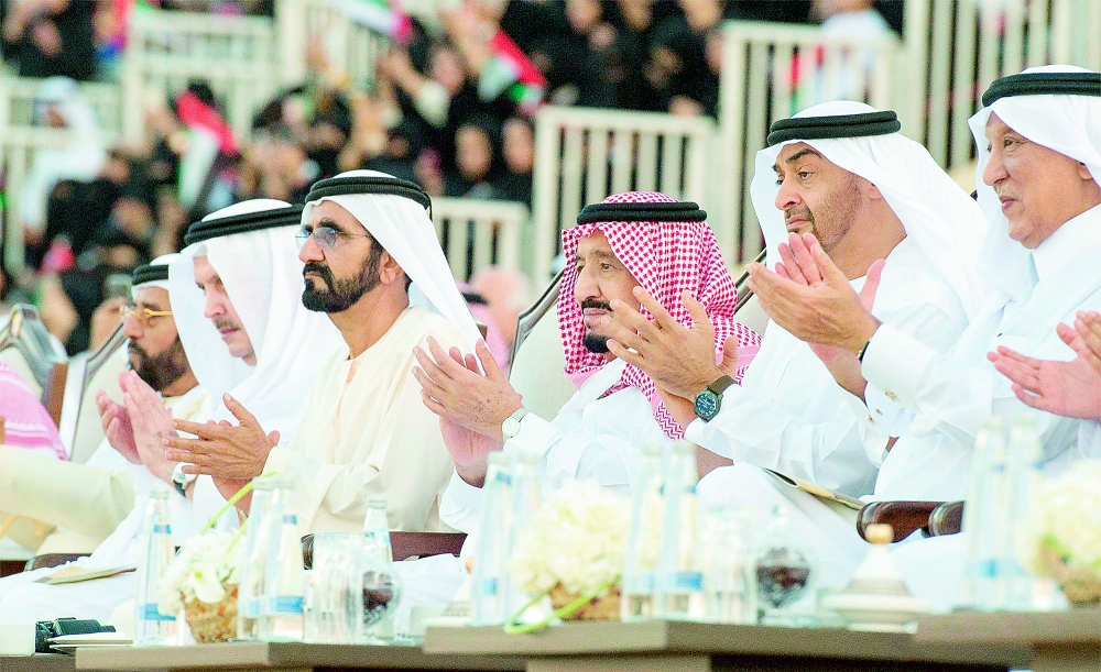 وبعد أن أخذ الملك سلمان مكانه في المنصة الرئيسية بدأت فقرات الحفل بعرضة «العيَّالة» أحد الفنون الشعبية الإماراتية ترحيبا به.