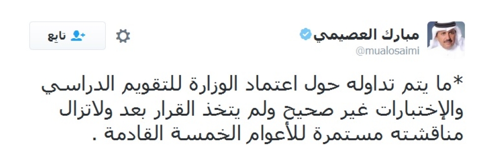 وقال في تغريدة عبر حسابه في تويتر: "ما يتم تداوله حول اعتماد الوزارة للتقويم الدراسي والاختبارات غير صحيح ولم يتخذ القرار بعد ولاتزال مناقشته مستمرة للأعوام الخمسة القادمة".