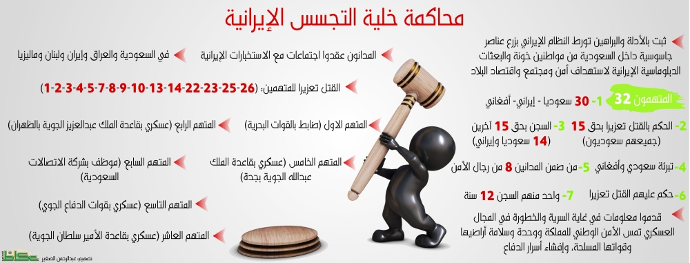 أصدرت الدائرة القضائية بالمحكمة الجزائية المتخصصة حكما بالقتل تعزيرا بحق المدعى عليه الـ13 (عسكري) لخيانته العظمى لدينه ومليكه وبلاده وحنثه في قسمه عند التحاقه بالسلك العسكري بارتكابه جريمة التجسس والتخابر مع عناصر من المخابرات الإيرانية عدة سنوات وهو على رأس العمل العسكري وتعاونه معهم لتحقيق أهدافهم الإجرامية من القيام بأعمال عدائية ضد السعودية وإفشائه عددا من المعلومات العسكرية تمس أمن البلاد ووحدة وسلامة أراضيها وقواتها المسلحة وتجنيده من قبل أخيه المدعى عليه الأول الذي يعمل لصالح الاستخبارات الإيرانية وتزويده أخاه المذكور بمستندات حصل عليها عن طريق عمله تحوي معلومات عسكرية وتكتيكية مهمة قام بجمع بعضها من عدة أشخاص وتزويده برسم لموقع الميناء العسكري الذي يعمل به وصورة كتاب عن صواريخ الباتريوت حصل عليها من أحد العاملين في الدفاع الجوي وعدة كتب عن عربة الهمر العسكرية وتجنيده ثلاثة أشخاص يعملون بالدفاع الجوي للعمل لصالح الاستخبارات الإيرانية وربطهم بأخيه وإعداده منزله وكرا لاجتماع عنصر الاستخبارات الإيراني مع عدد من العملاء الاستخباراتيين.