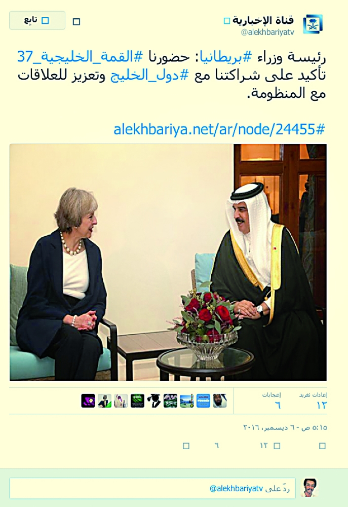 أكدت رئيسة وزراء بريطانيا تيريزا ماي أن حضورها القمة الخليجية الـ 37 في المنامة تأكيد على شراكة بريطانيا مع دول الخليج، وحرصها على تعزيز العلاقات مع المنظومة الخليجية. وكان المتحدث باسم الحكومة البريطانية في الشرق الأوسط وشمال إفريقيا إدوين صمويل أعلن الأحد الماضي أن رئيسة الوزراء البريطانية ستحضر قمة مجلس التعاون الخليجي في المنامة، وذلك في أول زيارة لها لمنطقة الخليج منذ تقلدها المنصب في يوليو الماضي.