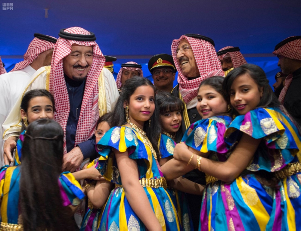وبعد أن أخذ خادم الحرمين الشريفين وسمو أمير دولة الكويت مكانهما في المنصة الرئيسة عزف السلام الملكي السعودي والوطني الكويتي.