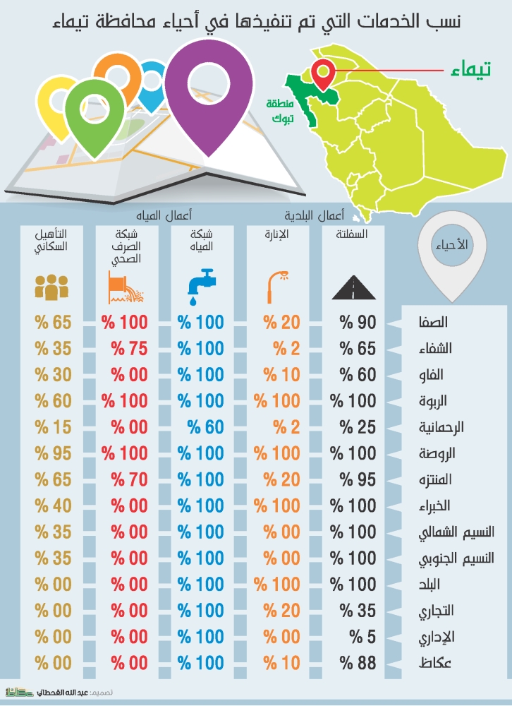 وإذا كان التقرير قد أوضح بشكل دقيق وشفاف واقع الخدمات البلدية وخدمات المياه والصرف الصحي المقدمة في المحافظة، فإن تيماء نالت نصيبها الكامل من المشروعات التنموية وجار استكمال العديد منها وفي مقدمتها مرافق التعليم بدءا من مرحلة الروضة إلى التعليم الجامعي والخدمات الصحية بانتشار المراكز الصحية في كافة المراكز التابعة وصولا إلى مستشفى تيماء العام الجديد، عدا أن جميع المراكز والقرى والهجر تغطى بالخدمات الكهربائية وترتبط بشبكة حديثة من الطرق.