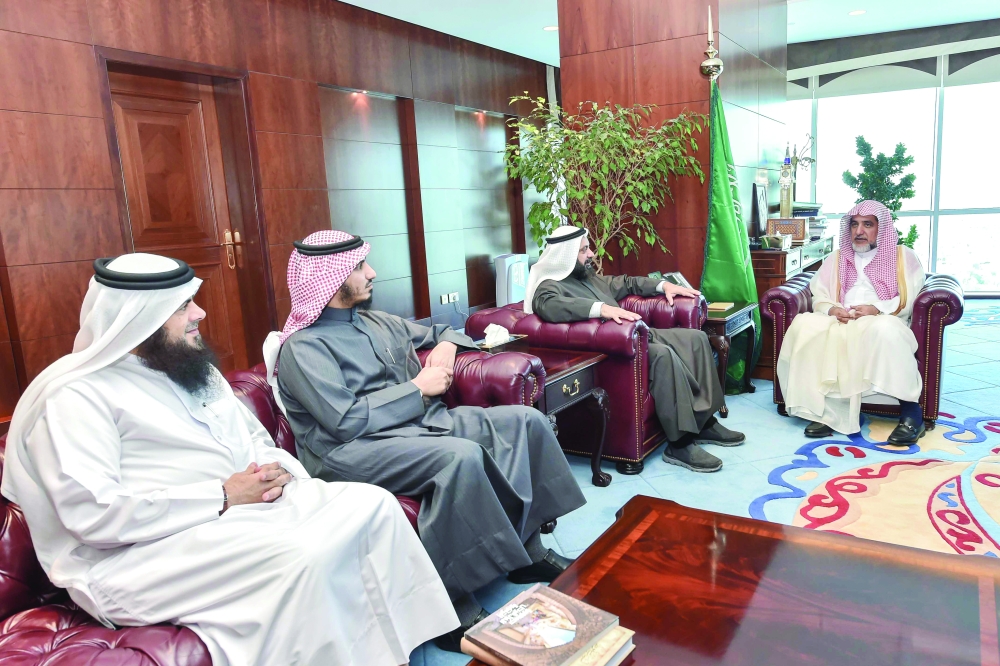 آل الشيخ مستقبلا وليد الطبطبائي ومرافقيه أمس في الرياض. (واس)
