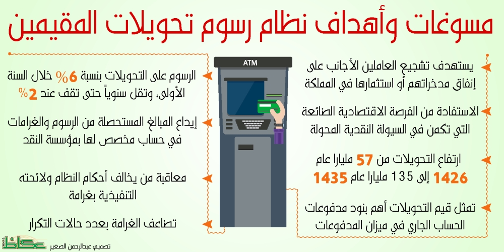 وسيكون رئيس ديوان المراقبة العامة عضو المجلس السابق الدكتور حسام العنقري حاضراً داخل قبة المجلس بمقترح نظامه الذي قدمه قبل مغادرته، ولقي تأييداً من اللجنة المالية آنذاك، ويتضمن وضع نظام لرسوم التحويلات النقدية للعاملين الأجانب. وبحسب العنقري فإن مسوغات النظام تتركز على الاستفادة من الفرصة الاقتصادية الضائعة التي تكمن في السيولة النقدية التي يتم تحويلها بواسطة العاملين الأجانب بشكل متنام ومستمر، إذ ارتفعت التحويلات النقدية للعاملين الأجانب المقيمين في المملكة من 57 مليارا عام 1426 إلى ١٣٥ مليار ريال عام 1435، وتمثل قيم هذه التحويلات أحد أهم بنود مدفوعات الحساب الجاري في ميزان مدفوعات المملكة، الذي يحدد فرض رسوم على التحويلات النقدية للعاملين في المملكة من غير السعوديين بنسبة ٦% من قيمة التحويل خلال السنة الأولى، وتقل النسبة سنوياً حتى تقف عند 2%، ويستهدف النظام تشجيع العاملين الأجانب على إنفاق مدخراتهم النقدية أو استثمارها داخل المملكة، ويختص النظام بفرض رسوم على التحويلات النقدية للعاملين الأجانب المقيمين في المملكة إقامة نظامية لصالح مستفيدين خارجها وإجراءات تحصيلها وتوجيهها. ووفق النظام المقترح فإنه يتم إيداع المبالغ المستحصلة من الرسوم والغرامات الخاضعة لهذا النظام في حساب مخصص لها بمؤسسة النقد، وتحدد اللائحة آلية الإيداع والحد النقدي المانع لتطبيق الرسم والمسموح للعامل الأجنبي نقله شخصياً عند مغادرته المملكة، وآليات وإجراءات تحصيل الرسوم والغرامات، وأيضاً الضوابط اللازمة لضمان تطبيق الرسم المقرر على نحو يحقق الأهداف التي أقر من أجلها، بما في ذلك ربط قيم التحويلات بالدخل الشهري النظامي للعامل، وضوابط لمنع التهرب من دفع الرسوم، وآليات الاعتراض وتبليغ المكلف بدفع الرسم بالقرارات الصادرة في حقه.