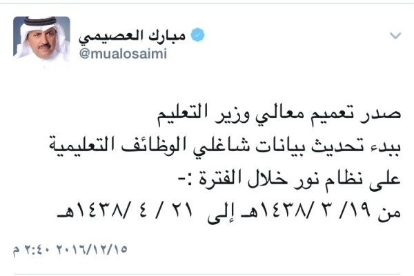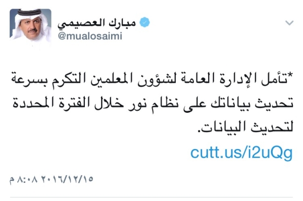 دعت وزارة التعليم، عبر تغريدة في حساب المتحدث باسمها مبارك العصيمي، المعلمين بسرعة تحديث بياناتهم، وذلك على خلفية التعميم الذي أصدره وزير التعليم الدكتور أحمد العيسى ببدء تحديث بيانات شاغلي الوظائف التعليمية على نظام نور خلال الفترة من ١٩/ ٣ /١٤٣٨هـ إلى ٢١ / ٤ /١٤٣٨هـ.
