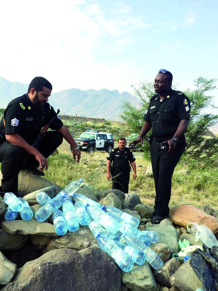 رجال الأمن خلال مداهمة وكر الخمور في محايل عسير. (عكاظ)