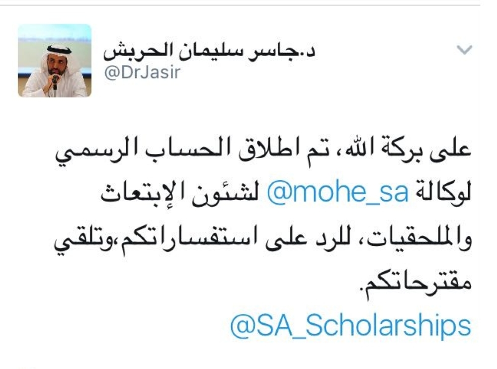 أعلن وكيل وزارة التعليم لشؤون البعثات والمشرف على الملحقيات الثقافية، الدكتور جاسر سليمان الحربش، عن إطلاق الحساب الرسمي في تويتر لشؤون الابتعاث والملحقيات الثقافية، وذلك للرد على جميع الاستفسارات وتلقي الاقتراحات.