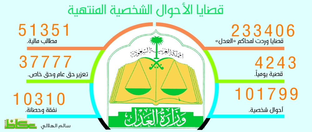 كشفت المؤشرات القضائية بوزارة العدل أن عدد القضايا الواردة الى محاكم المملكة (عامة – جزائية – أحوال شخصية) بلغ 233406 قضايا منذ مطلع العام الحالي (1438) حتى الخميس 16 ربيع أول، بمعدل 4243 قضية يومياً. وشكلت المطالب المالية 25% من القضايا،(51351 قضية) والأحوال الشخصية 43.6% (101799 قضية) والقضايا الجزائية 19% (44786 قضية) وتصدرت محاكم منطقة مكة المكرمة عدد القضايا الواردة إليها، حيث بلغت 58462 قضية، شكلت 25% من كل القضايا الواردة لمحاكم المملكة، تليها محاكم منطقة الرياض 54428 قضية ونسبة 23.3%، محاكم المنطقة الشرقية 27387 قضية، ونسبة 11.7%، محاكم منطقة عسير 20705 قضية، ونسبة 8.8%، ومحاكم المدينة المنورة 16017 قضايا ونسبة 6.8%. وشكلت قضايا الحق العام 75.7% من القضايا الجزائية (33897 قضية) بينما شكلت قضايا الحق الخاص 24.3% منها (10899 قضية). كما شكلت قضايا التعزير 84.3% من إجمالي القضايا الجزائية (37777 قضية منها 2748 تعزير حق عام و10293 تعزير حق خاص). كما شكلت قضايا الإنهاءات 80% من قضايا الأحوال الشخصية الواردة إلى المحاكم، بينما شكلت الدعاوى 20% منها. وشكلت إنهاءات النكاح 44.9% من قضايا الأحوال الشخصية الواردة للمحاكم (45557 قضية)، بينما قضايا النفقة والزيارة والحضانة 10% منها (10310 قضايا).