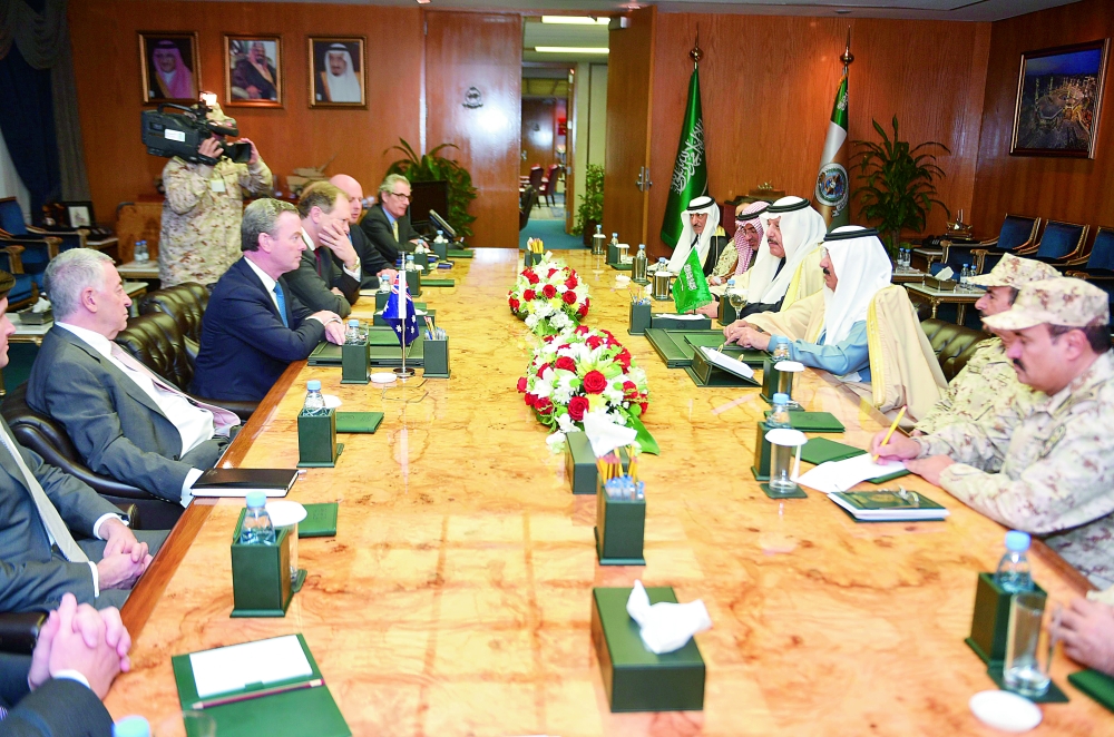 وزير الحرس الوطني خلال لقائه وزير الصناعات العسكرية الأسترالي أمس في الرياض. (واس)