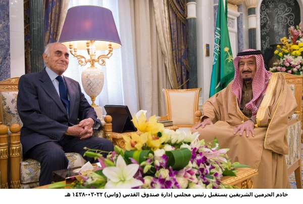 استقبل خادم الحرمين الشريفين الملك سلمان بن عبدالعزيز في مكتبه بقصر اليمامة في الرياض اليوم، رئيس مجلس إدارة صندوق القدس منيب المصري، يرافقه أعضاء مجلسي الإدارة والأمانة العامة لصندوق ووقفية القدس. ورحب خادم الحرمين برئيس مجلس إدارة صندوق القدس، وأعضاء مجلسي الإدارة والأمانة العامة لصندوق ووقفية القدس في المملكة.