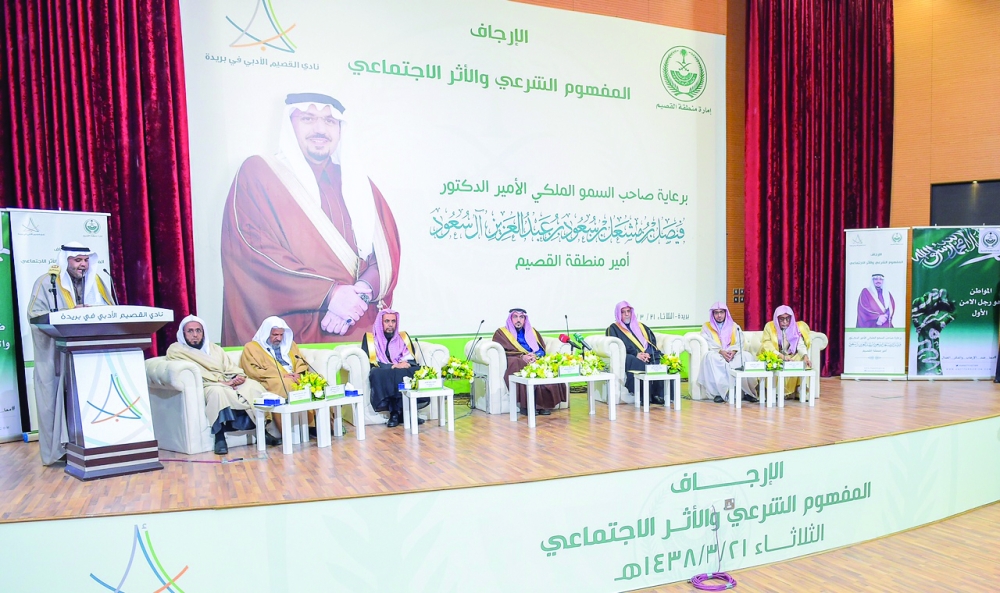 أمير القصيم خلال ندوة الإرجاف مع المحاضرين. (عكاظ)