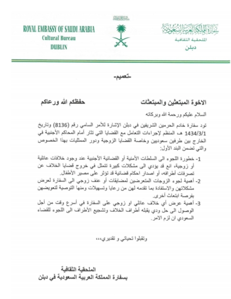 حذرت الملحقية الثقافية السعودية في إيرلندا، المبتعثين السعودين من خطورة اللجوء إلى السلطات الأمنية أو القضائية الأجنبية عند وجود خلافات عائلية أو زوجية وعواقب الأحكام القضائية الناتجة عن مثل هذه القضايا على مصير الأطفال.