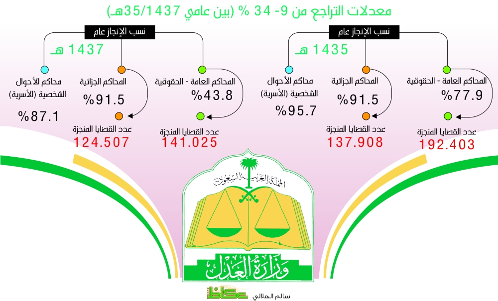 كما بينت المؤشرات أن نسبة الإنجاز في محاكم الأحوال الشخصية (الأسرية) في سنة ١٤٣٥ بلغت 95.7% في حين تراجع الأداء إلى 87.1% في عام ١٤٣٧بنسبة تراجع بلغت 8.9% حسبما ورد في الرابط التالي من موقع الوزارة: https://www.moj.gov.sa/ar/bi/bijudicial/Dashboards/200_kpiAchievement/kpi200_03.aspx