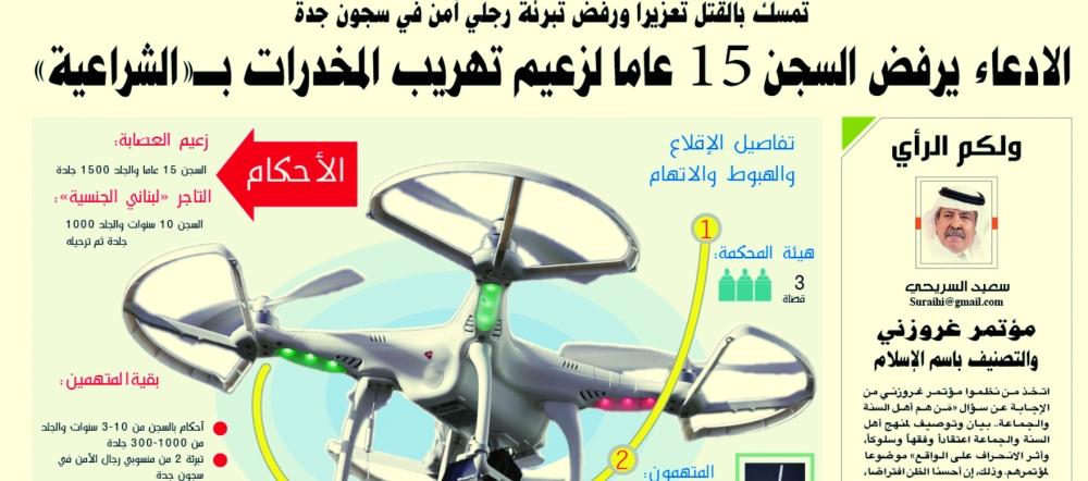 تعد «عكاظ» أول من سلطت الضوء على أولى قضايا محاولات استخدام طائرات «عن بعد» لتهريب الممنوعات إلى داخل السجون، بعدما تم ضبط عصابة في جدة تحاول تهريب وترويج مخدرات إلى نزلاء سجن بريمان باستخدام طائرات فانتوم (ذات أربع مراوح) يتم إطلاقها من مواقف مجاورة للسجن وتوجيهها الى أحد العنابر بالريموت كنترول. وتم القبض على العقل المدبر وزعيم العصابة اللذين يقفان خلف هذه الجريمة ومعهما سبعة مشاركين، واتضح أن لبنانيا وراء بيع تلك الطائرات. وأدانت دائرة القصاص والحدود في المحكمة الجزائية في جدة في سبتمير الماضي المتورطين وأصدرت أحكاما بالسجن لـ سبعة منهم شملت 15 سنة لزعيم العصابة ومدد تتراوح بين 3 - 10 سنوات لبقية المتهمين منهم بائع الطائرات اللبناني، وتبرئة اثنين من منسوبي رجال الأمن في سجون جدة، إلا أن المدعي العام اعترض على جميع الأحكام متمسكاً بطلبه القتل تعزيرا لرئيس العصابة لتعدد سوابقه وتغليظ العقوبة على البقية.