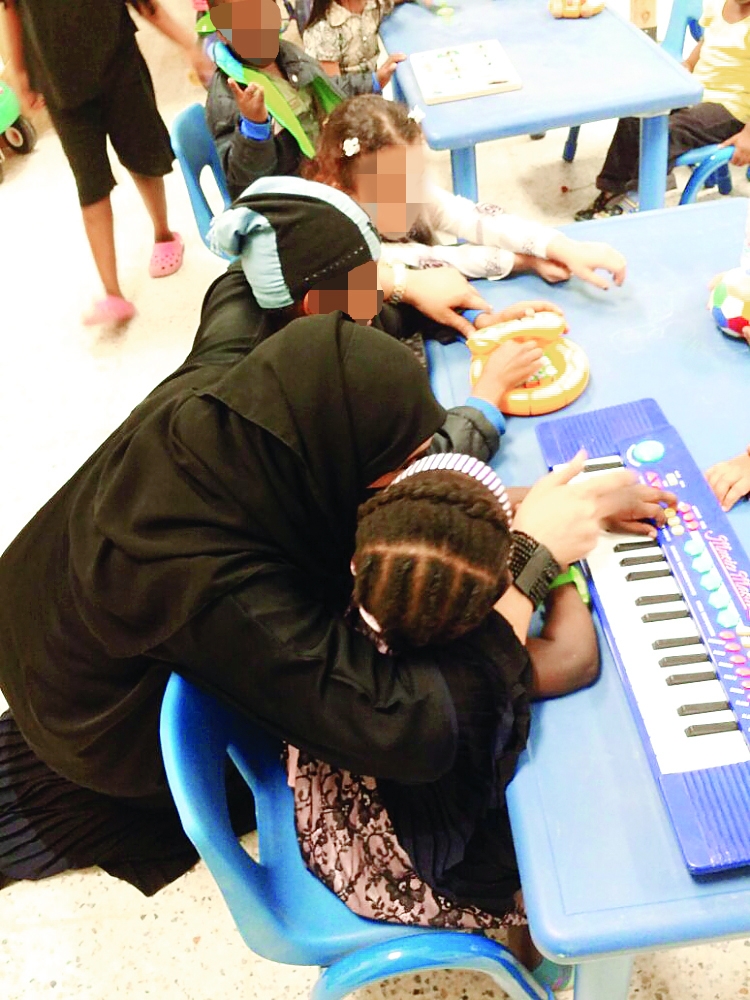 محررة «عكاظ» مع طفلة تداعب آلة موسيقية في فترة الترفيه.