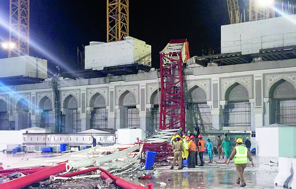 الرافعة بعد سقوطها في ساحة المسجد الحرام. (عكاظ)