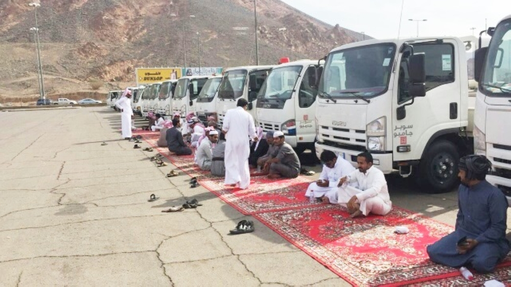 سائقون خلال تجمعهم في مواقف الاستاد بالمدينة المنورة أمس. (عكاظ)