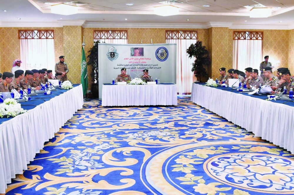 المحرج خلال اجتماعه بمديري المرور وقادة أمن الطرق. (عكاظ)