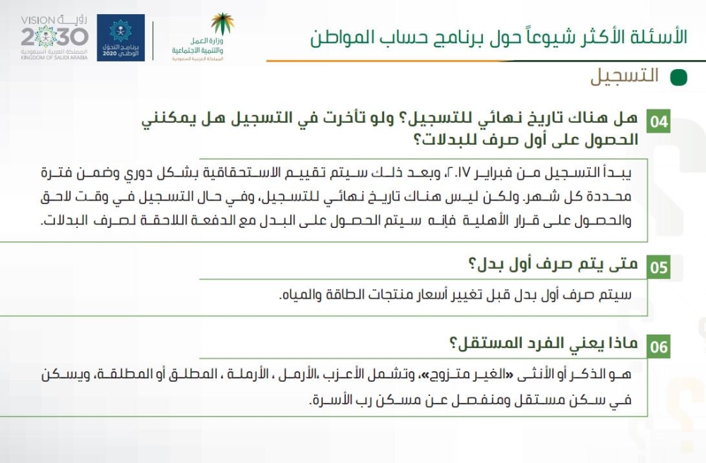 ومن المقرر أن يكون التسجيل في برنامج حساب المواطن عبر منصة إلكترونية، سيتم إطلاقها في الأول من فبراير 2017م، علماً أنه سيتم صرف البدلات للأسر المستحقة قبل تنفيذ أي من الإصلاحات الاقتصادية التي قد تمس بحالة المواطن، كما سيتم الإعلان عن قيمة البدل المالي مع كل عملية إصلاح اقتصادي، إضافة إلى إتاحة حاسبة افتراضية ليتعرف المواطنون والمواطنات على قيمة البدل الذي سيحصلون عليه في حينه.