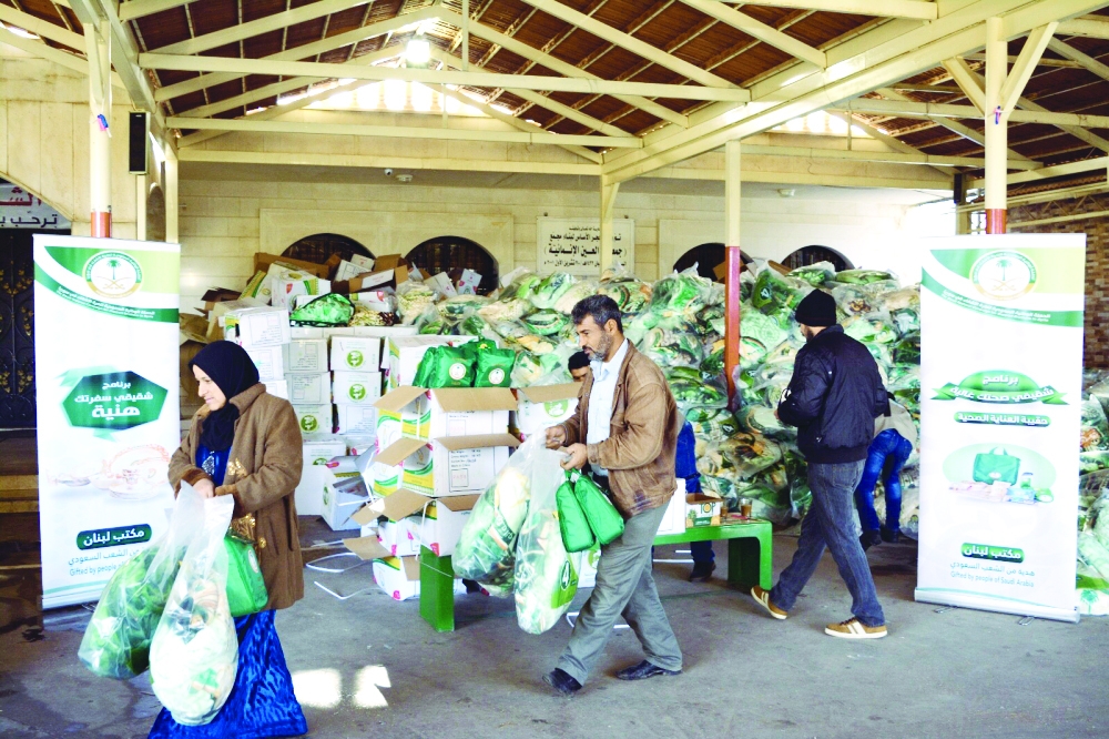 لاجئون سوريون يتسلمون حصتهم من المساعدات السعودية. (عكاظ)