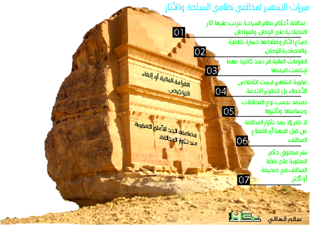 وبيّنت المصادر أن التقرير شمل أيضاً إيقاع عقوبة التشهير والغرامات بكل من يسيء إلى الآثار بتضييعها وفقدها مما يتسبب في خسائر ثقافية واقتصادية وحضارية للبلاد، وأيدت اللجنة إضافة هذه العقوبات على هيئة بنود إلى نظامين قائمين هما: نظاما السياحة والآثار، والآثار والمتاحف والتراث العمراني، وهو ما يتوافق مع حرص الدولة على حماية السياحة والآثار والتراث العمراني.