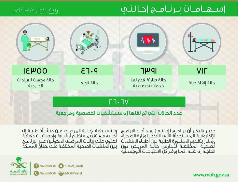 أسهم برنامج إحالتي في وزارة الصحة في شهر ربيع الأول في إنقاذ حياة (712) مريضا راجعوا أقسام الطوارئ بعدد من المناطق حيث قدمت الطواقم الطبية للحالات الحرجة خدمات طبية تخصصية أسهمت في إنقاذ حياتهم.