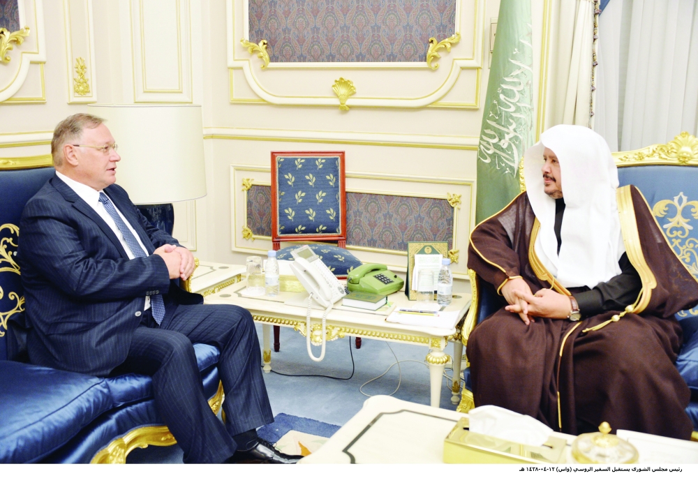 رئيس مجلس الشورى مستقبلا السفير الروسي أوليغ أوزيروف أمس في الرياض. (واس)