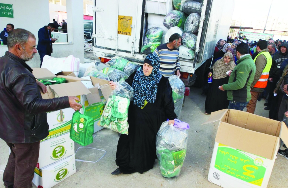 أثناء توزيع المساعدات على اللاجئين السوريين في الأردن أمس.