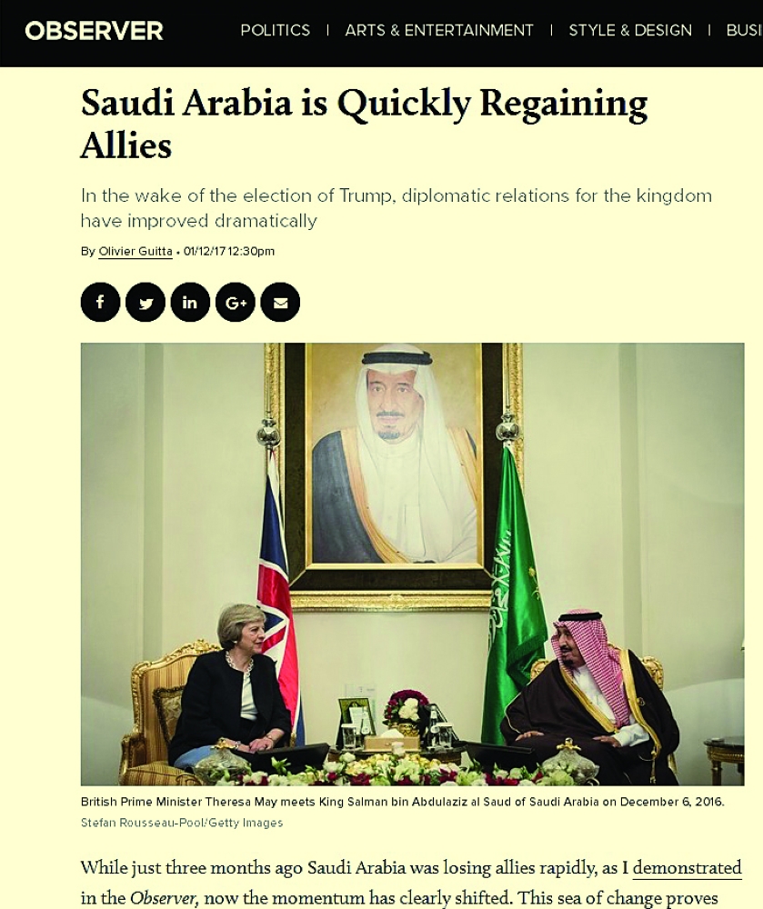 وذكر فيه أنه قبل نحو ثلاثة أشهر فقط، توترت العلاقات بين المملكة وحلفائها الإستراتيجيين وأصابها فتور شديد وكادت أن تفقدهم خصوصا الولايات المتحدة بسبب السياسات المعيبة لأوباما في المنطقة، ولكن في أعقاب انتخاب دونالد ترمب طرأ تحسن كبير في العلاقات الدبلوماسية للمملكة مع حلفائها السابقين.