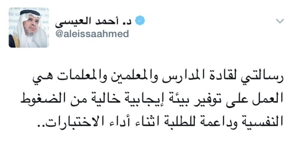 حيث غرد الوزير العيسى عبر حسابه الرسمي على "تويتر"، مضيفاً : "ونحن على أبواب اختبارات الفصل الدراسي الأول، أسأل الله التوفيق لأبنائنا وبناتنا في كافة مراحل التعليم العام والجامعي".