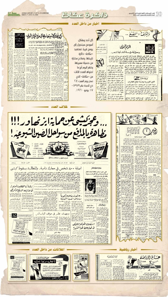 كل أحد وبشكل أسبوعي سيتحول إلى يومي قريبا، تستعيد «عكاظ» ذاكرة تاريخها، ونماذج مختارة من حصيلة مسيرتها. وتنشر اليوم أبرز ما احتواه العدد الثالث من «عكاظ» الذي صدر يوم السبت 24 ذي الحجة عام 1379- 17 يونيو 1960.