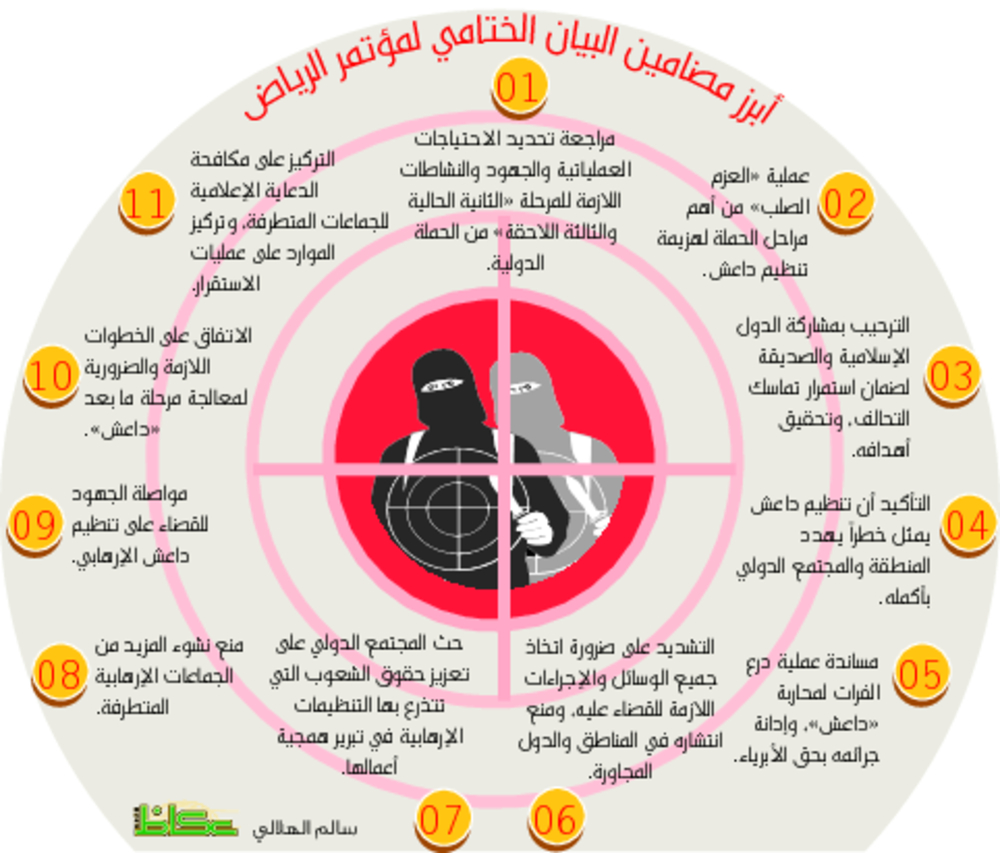 وكانت أعمال المؤتمر افتتحت في فندق الرتز كارلتون بالرياض، وبحث الاجتماع رفع مستوى التنسيق بين ممثلي الدول المشاركة، وتعزيز جهود التحالف الدولي الذي حقق تقدما ملموسا في الفترة الأخيرة في عملياته التي تستهدف شل قدرات التنظيم الإرهابي، إضافة لبحث سبل تعزيز مشاركة دول العالم العربي والإسلامي المشاركة في التحالف، وتحديد وفهم التحديات الحالية والمستجدات الطارئة في الحرب على تنظيم «داعش» الإرهابي.