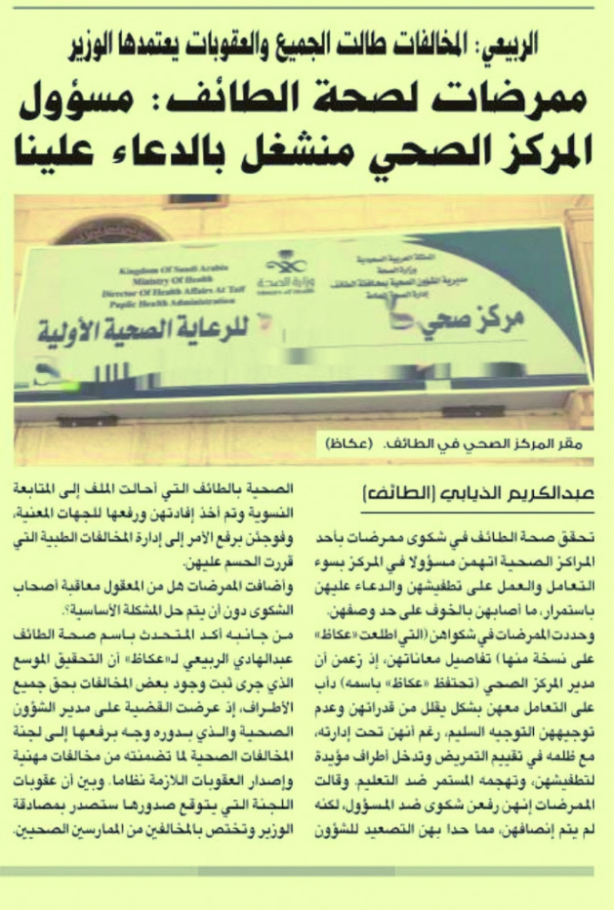 وكانت «عكاظ» نشرت أمس تقريرا عن تظلّم ممرضات مركز صحي في الطائف من سوء معاملتهن من إحدى المشرفات وتطفيشهن.