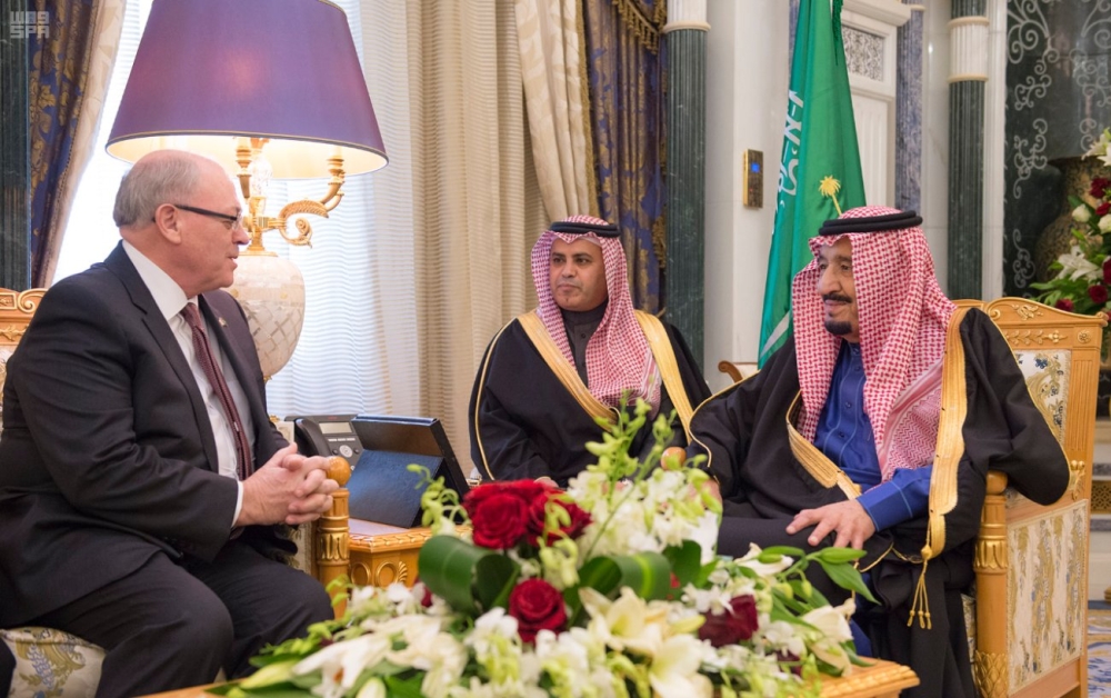 استقبل خادم الحرمين الشريفين الملك سلمان بن عبدالعزيز في مكتبه بقصر اليمامة اليوم رئيس مجلس الشيوخ الكندي جورج فيوري.