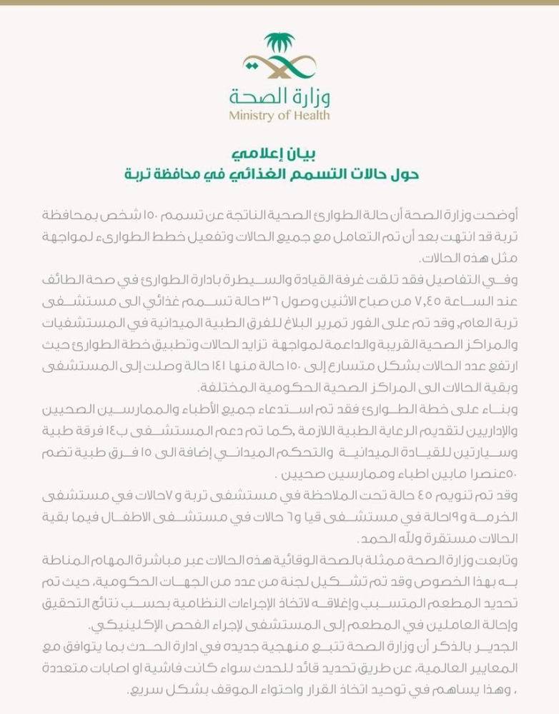 وأوضحت الصحة في بيان أصدرته أن غرفة عمليات القيادة و السيطرة في صحة الطائف تلقت صباح اليوم وصول 36 حالة تسمم غذائي إلى مستشفى تربة العام، مضيفةً أنه تم على الفور تمرير البلاغ إلى الفرق الطبية الميدانية في المستشفيات والمراكز الصحية القريبة والداعمة لمواجهة تزايد الحالات وتطبيق خطة الطوارئ.
