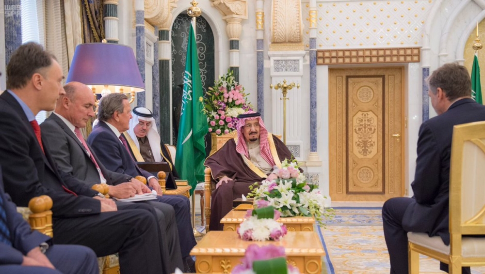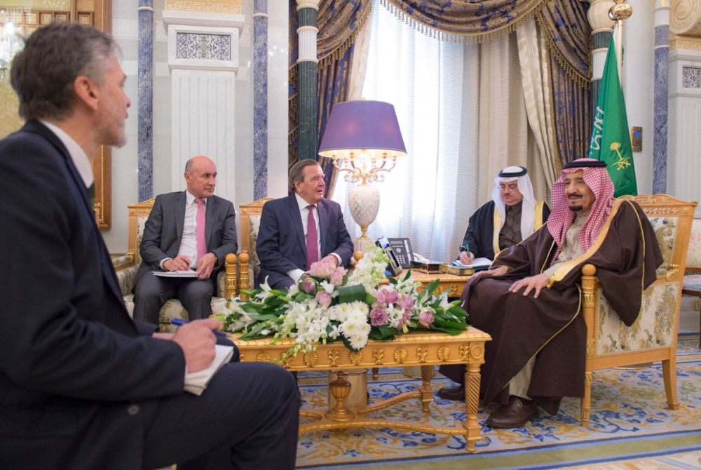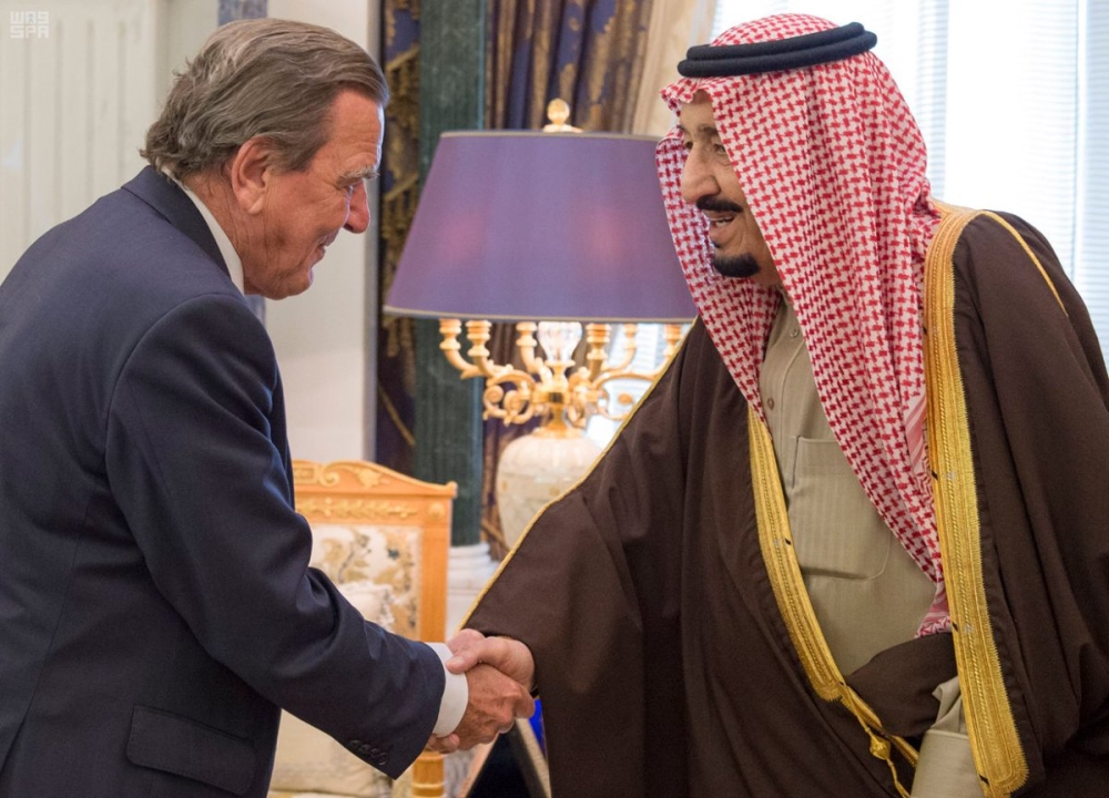 استقبل خادم الحرمين الشريفين الملك سلمان بن عبدالعزيز في مكتبه بقصر اليمامة اليوم دولة مستشار ألمانيا السابق والرئيس الفخري للجمعية الألمانية للشرق الأدنى والأوسط جيرهارد شرودر .