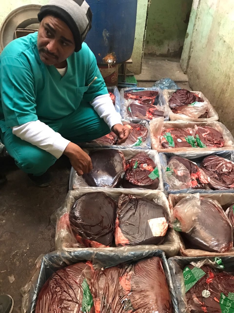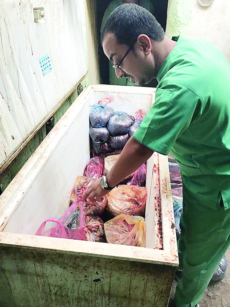 أحبطت أمانة الرياض بالتعاون مع الشرطة والدفاع المدني توزيع 2438 طن لحوم وكوارع وكبدة كانت معدة للتوزيع على مطاعم وبوفيهات مدينة الرياض، قبل ضبطها داخل منازل شعبية في حي البطحاء وسط (العاصمة).وقال المدير العام للإدارة العامة لصحة البيئة في أمانة المنطقة الدكتور فلاح الدوسري: إن فرق طوارئ الإدارة وفرقة من إدارة المسالخ بمشاركة ودعم من شرطة الرياض والدفاع المدني داهمت عصر أمس مواقع تم رصدها في حي البطحاء وتحديدا خلف أسواق اللحوم، وعُثر على كميات من اللحوم والكوارع والكبدة وشحوم ورؤوس أغنام ومقادم أغنام وأبقار وجمال وكلاوي، بلغ حجمها أكثر من 2438 طنا مخزنة داخل منازل شعبية ووسط بيئة سيئة.
